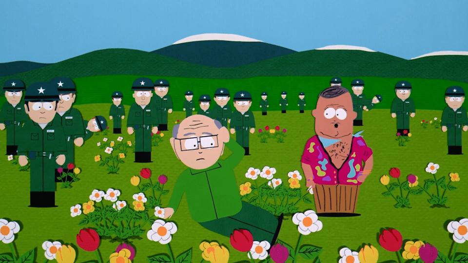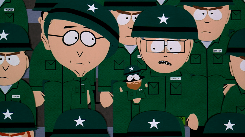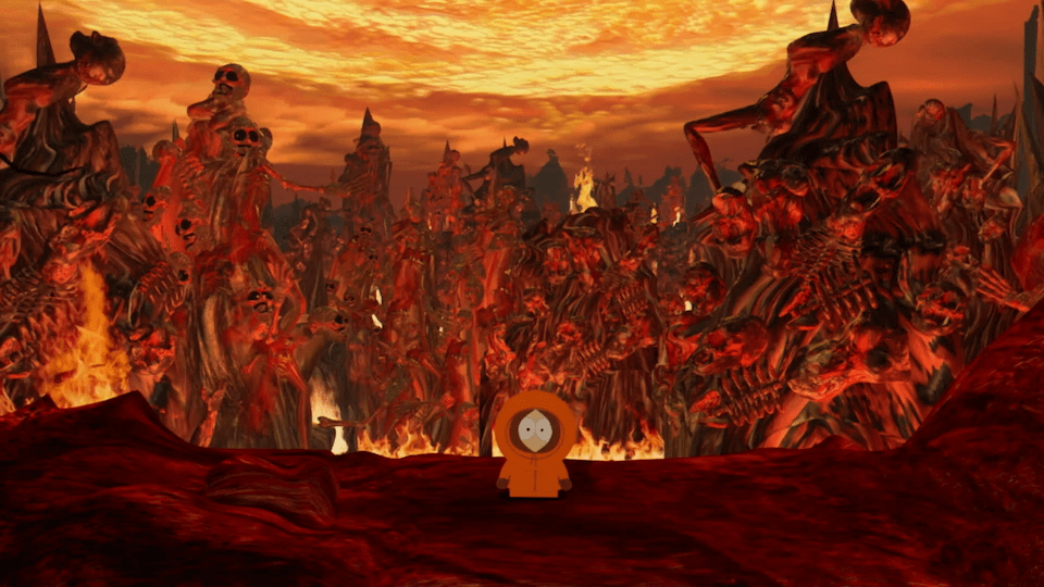 Matt Stone voices Kyle Broflovski / Kenny McCormick classic / Saddam Hussein[5] (credited to “Himself”) / Terrance Henry Stoot / Big Gay Al / Ticket Taker / Stuart McCormick / Jimbo Kearn / Gerald Broflovski / Butters Stotch / American Ambassador
