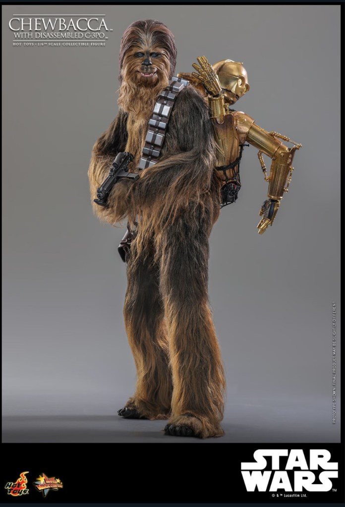 The exquisitely crafted Chewbacca collectible figure features a newly developed sculpt styled in wool hair with articulated jaw, multiple layers of fabric hair with various shades of brown throughout his whole body, a distressed brown bandolier, a blaster, a bowcaster, handcuffs and a display stand. In addition, this collectible figure includes a disassembled C-3PO with body parts finished in chrome application. A net is also included for fans to recreate where Chewbacca carries C-3PO on his back in the movie.